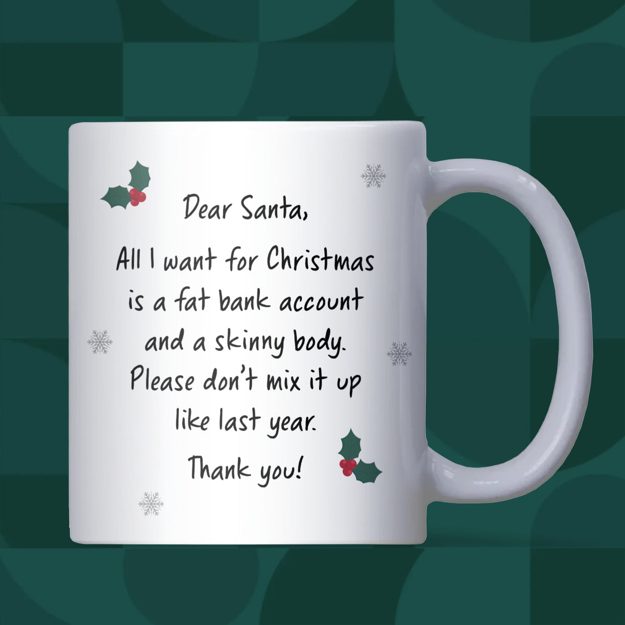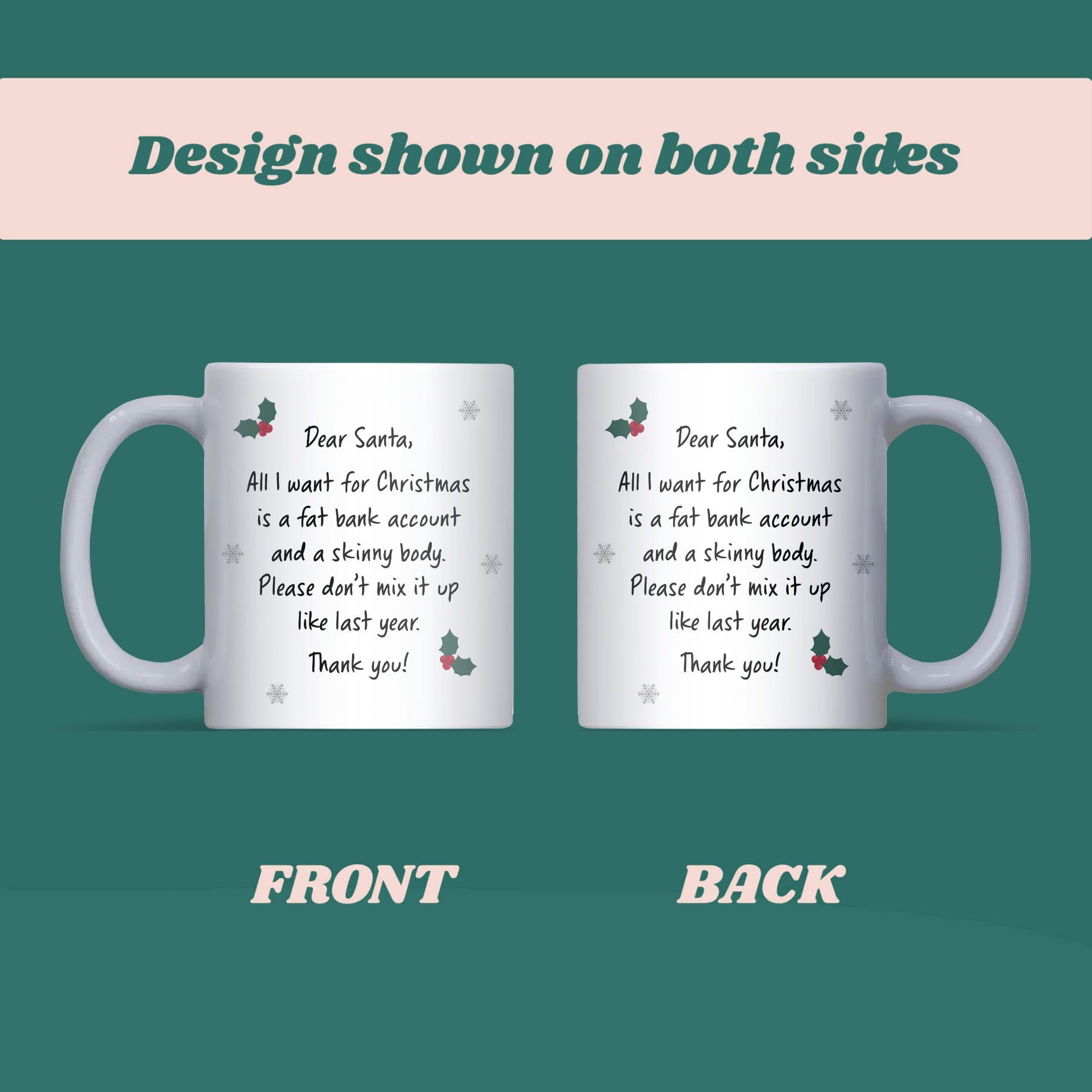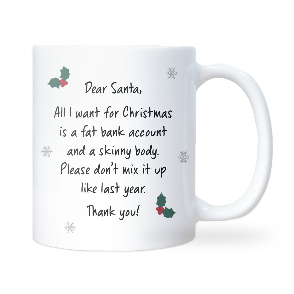 Dear Santa I Want a Fat Bank Account and a Skinny Body Mug, Funny Christmas Mug for Her, Xmas Joke Gift for Sister, Best Friend Christmas