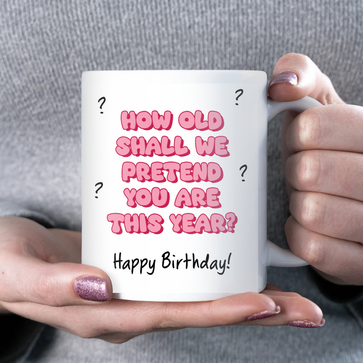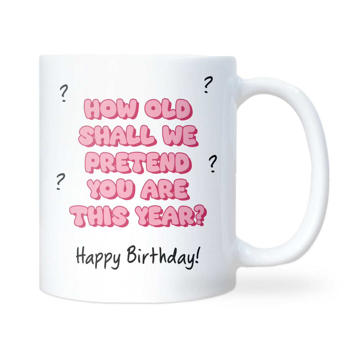 Make them laugh on their special day with this cheeky How Old Shall We Pretend You Are This Year? birthday mug. A funny and thoughtful gift for milestone birthdays such as 40th, 50th, or 60th. Great for friends, colleagues, or family members who don’t want to be reminded of their real age!