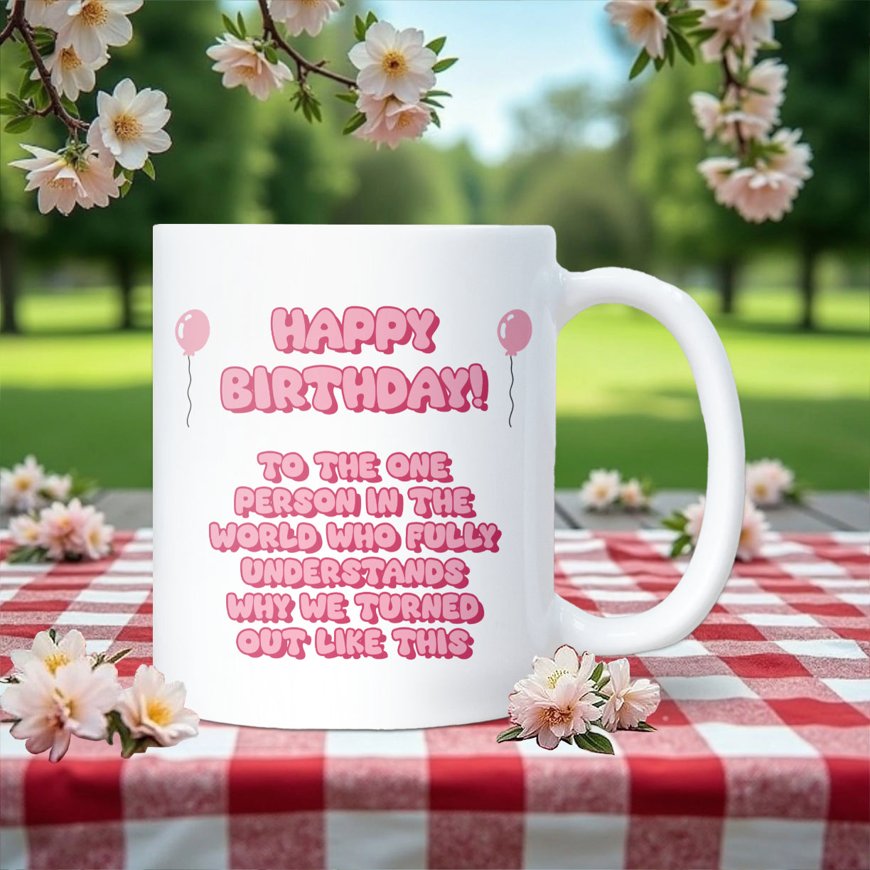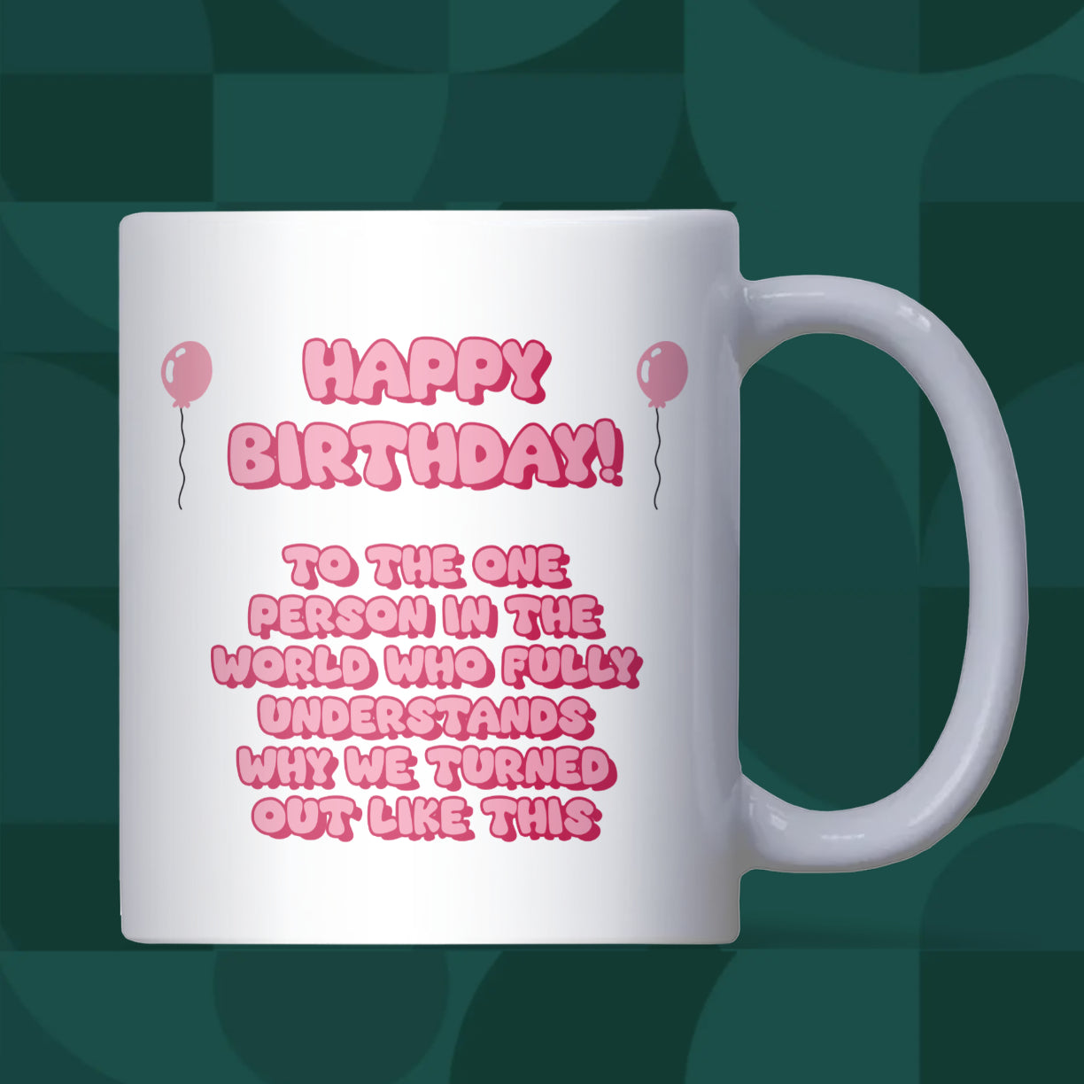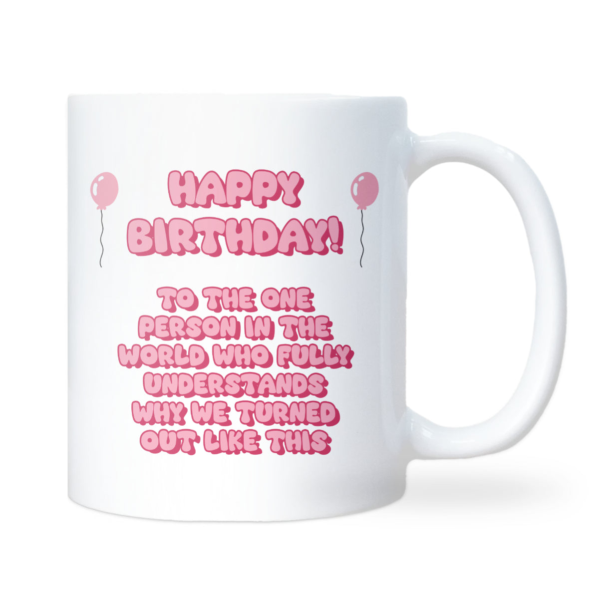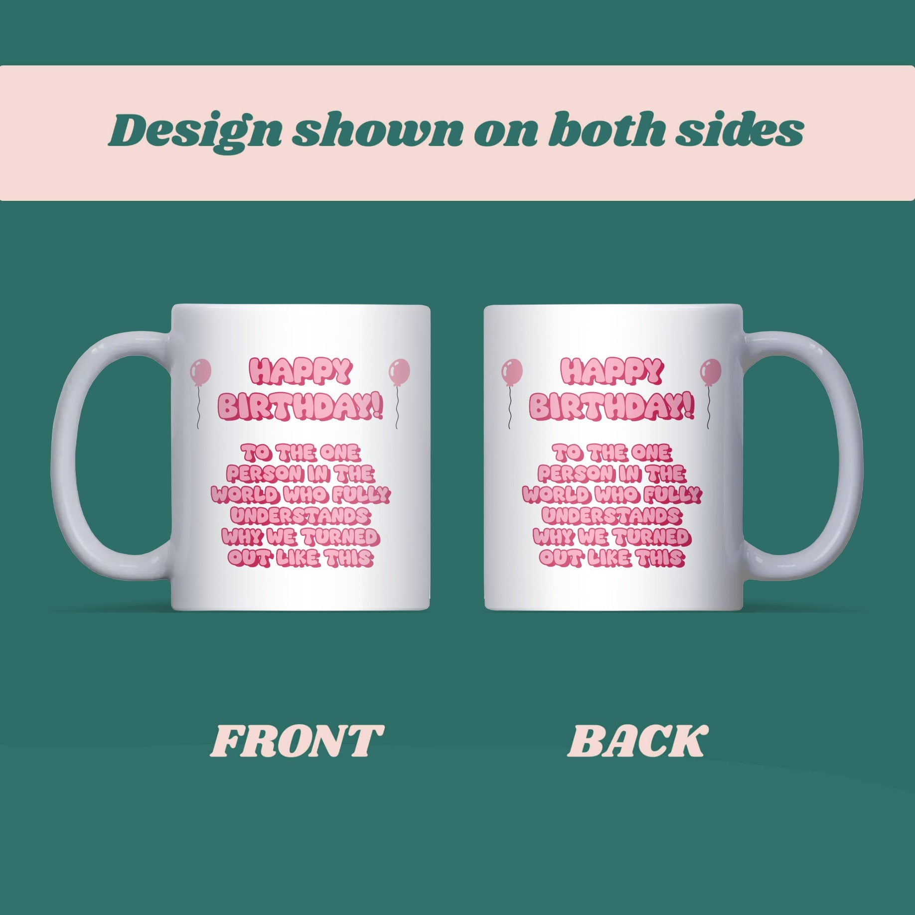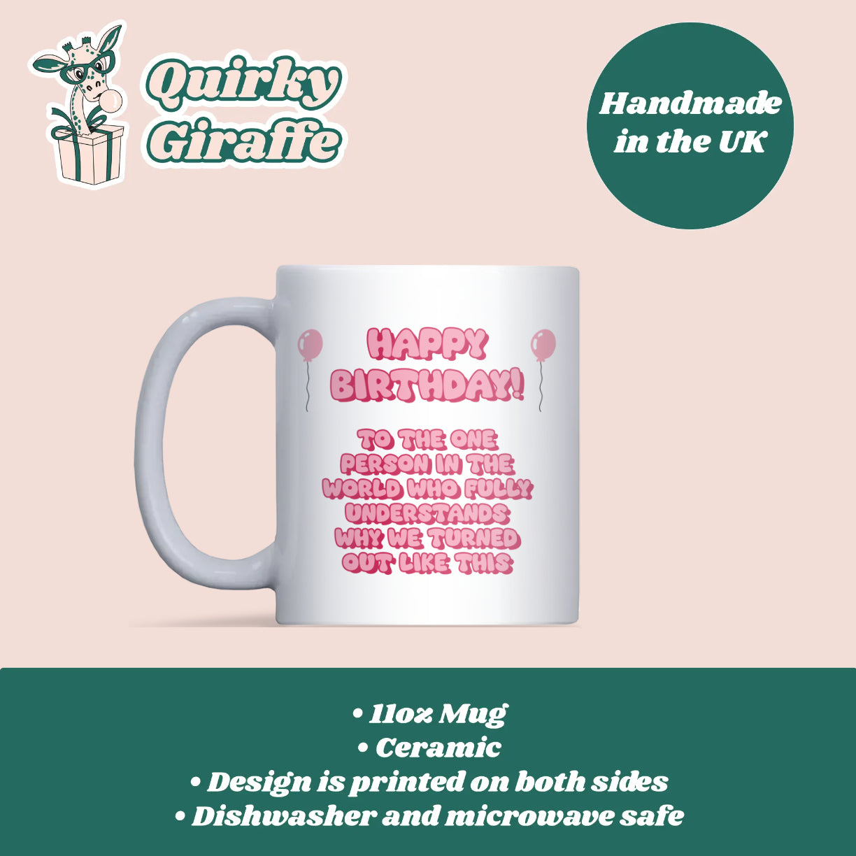 Make her laugh out loud on her birthday with this hilarious sister mug – Happy Birthday to the one person in the world who fully understands why we turned out like this. A cheeky, heartfelt gift from brother or sister, perfect for birthdays, Christmas, or just to show your love.