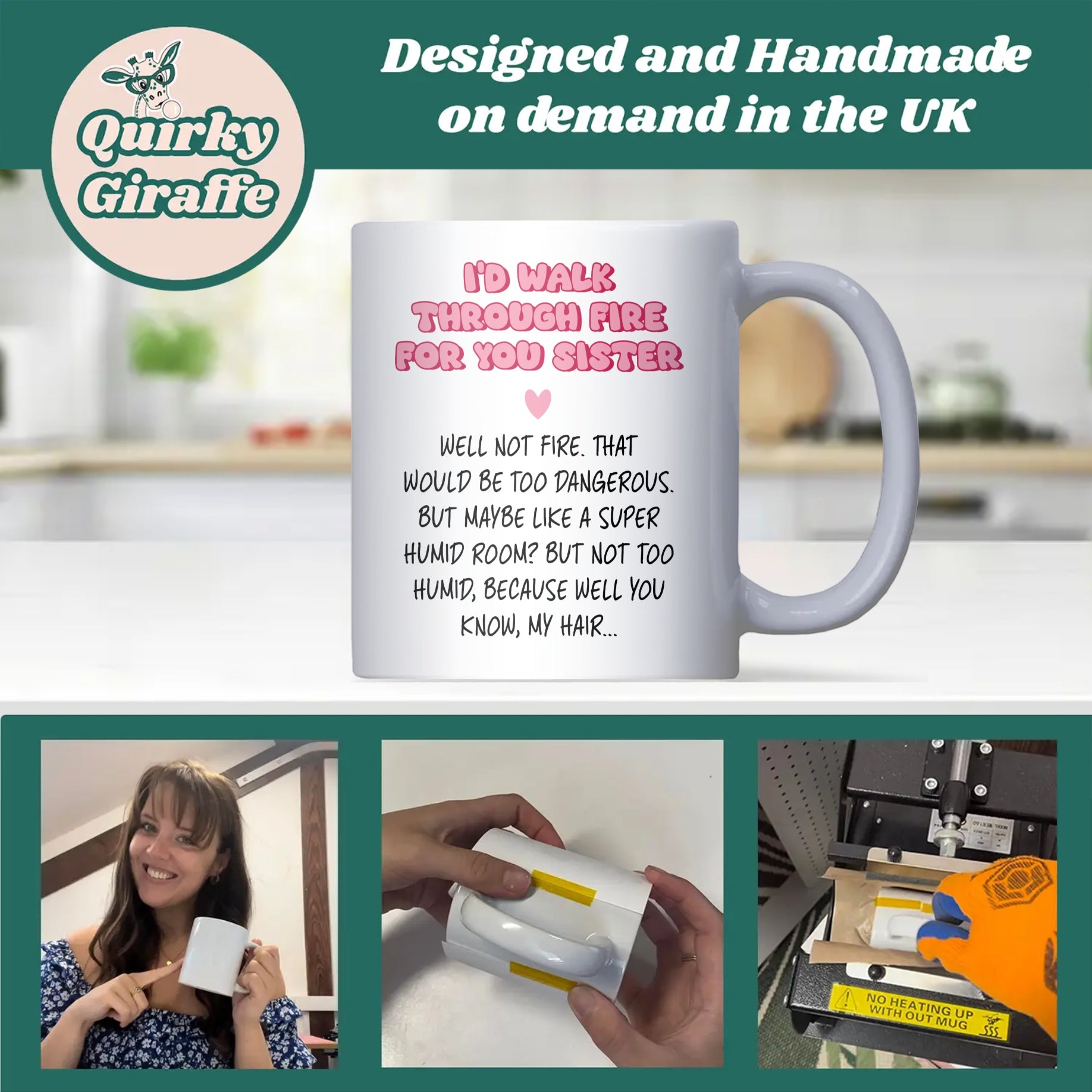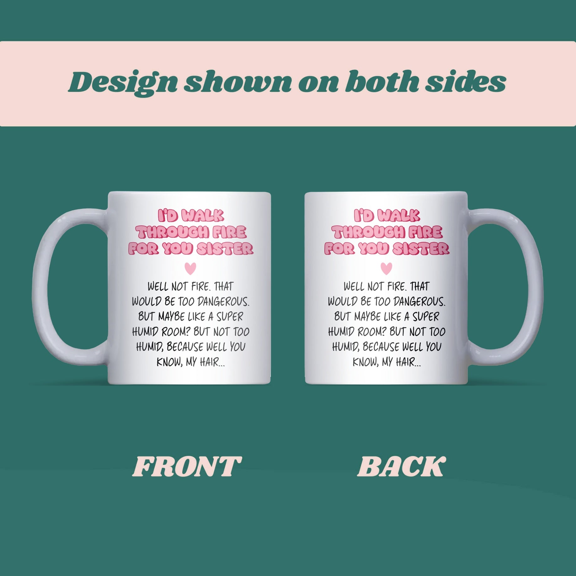 Show your love (with a twist!) with this funny sister mug. Featuring the cheeky message I’d walk through fire for you, well maybe not fire because that would be super hot… it’s a perfect birthday gift, Christmas present, or just-because treat for your sister.