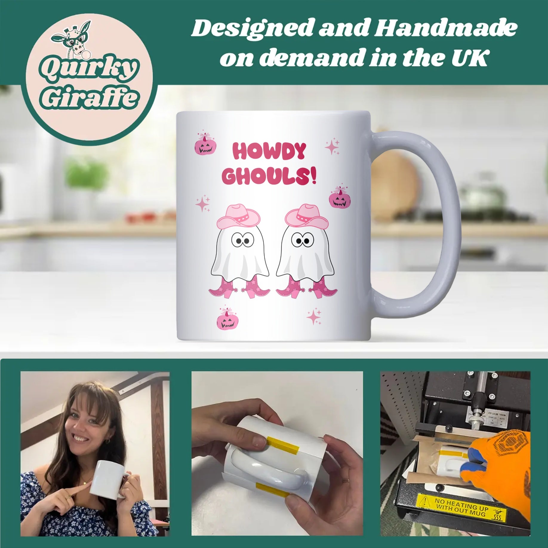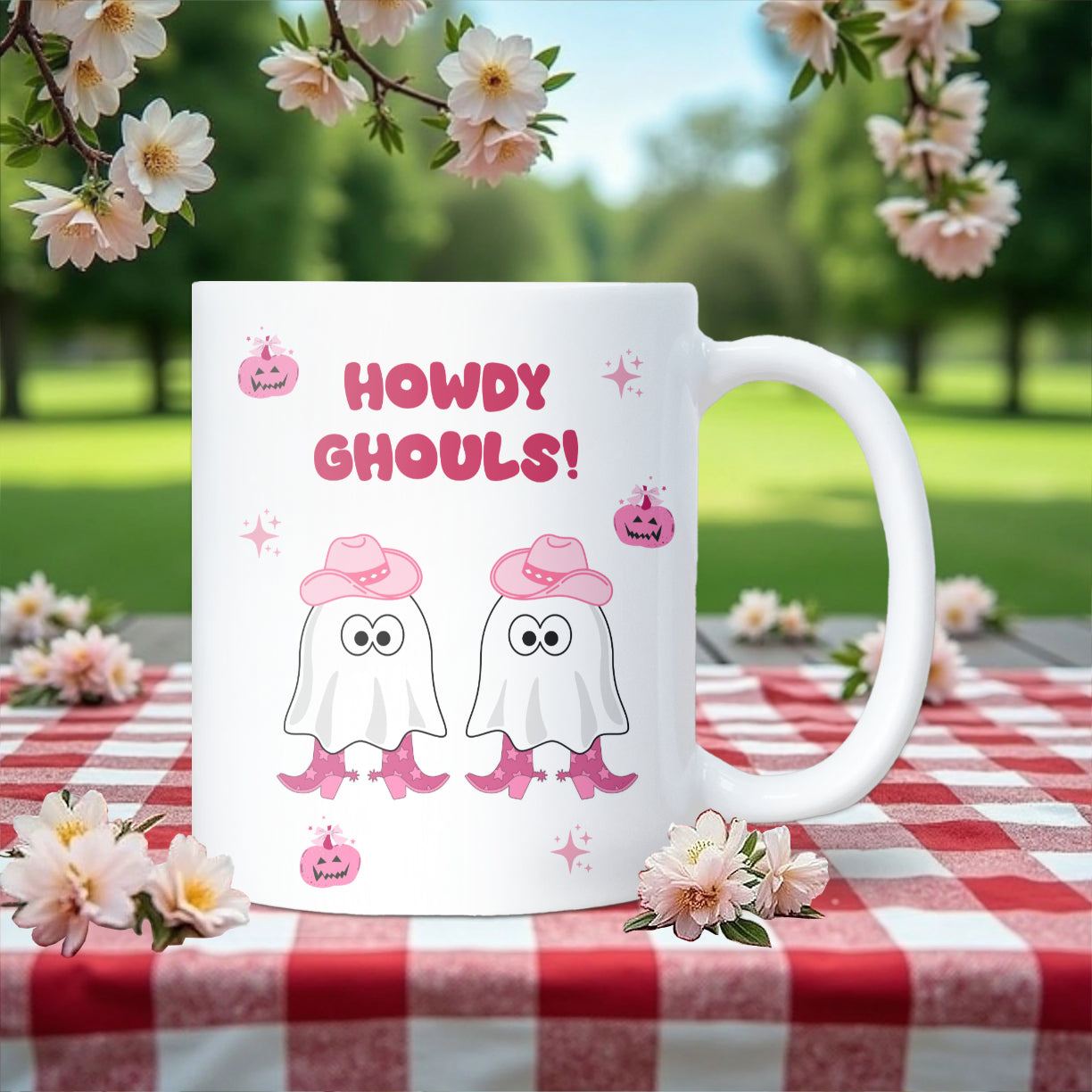 Howdy Ghouls Mug, Funny Halloween Mug for Her, Pink Cowgirl Ghost Cup, Girly Spooky Season Coffee Mug, Cute Ghost Gift, Halloween Cowgirl