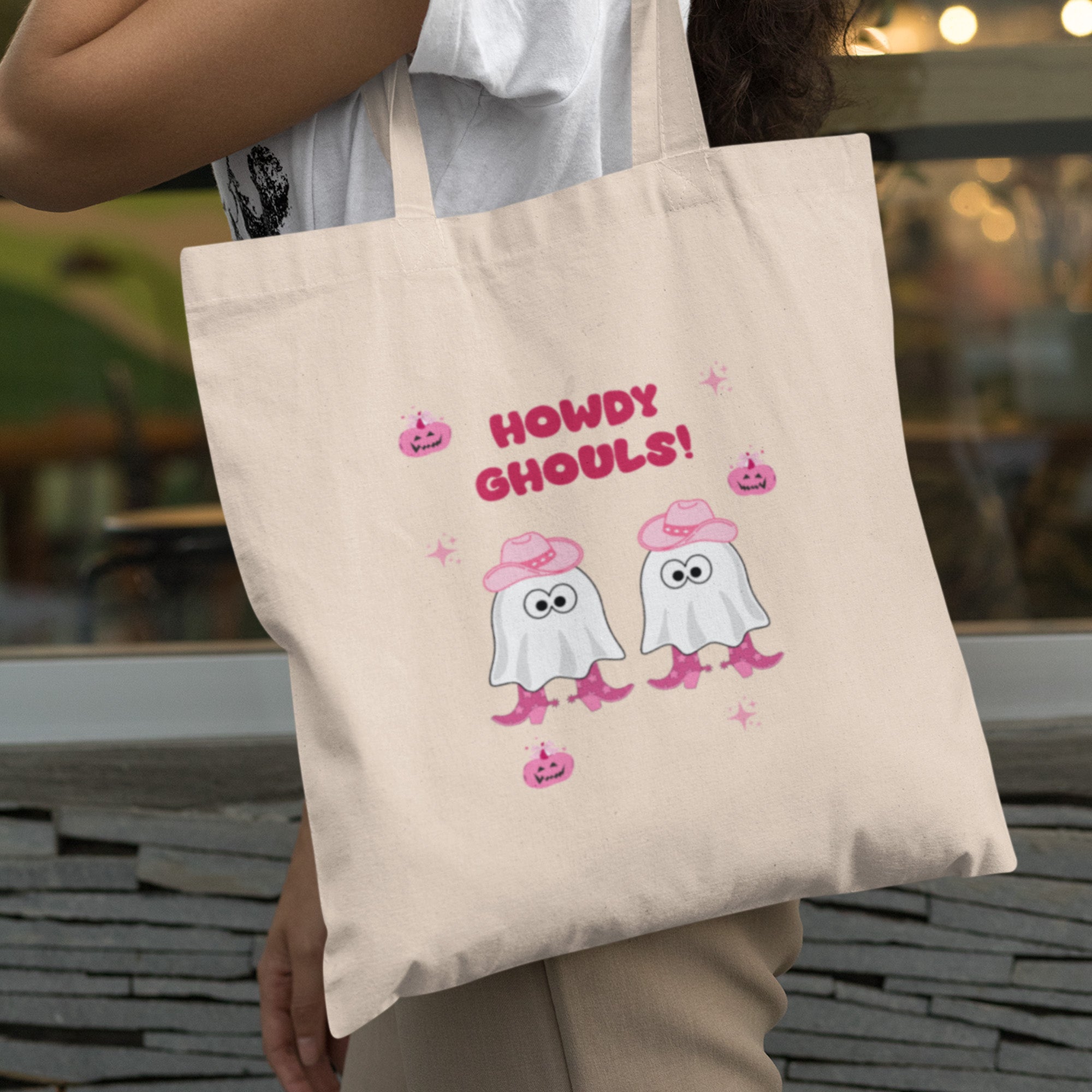 Howdy Ghouls Tote Bag, Cute Pink Ghost Halloween Tote, Funny Boo Basket Gift for Her, Girlfriend Halloween Bag, Best Friend Boo Box