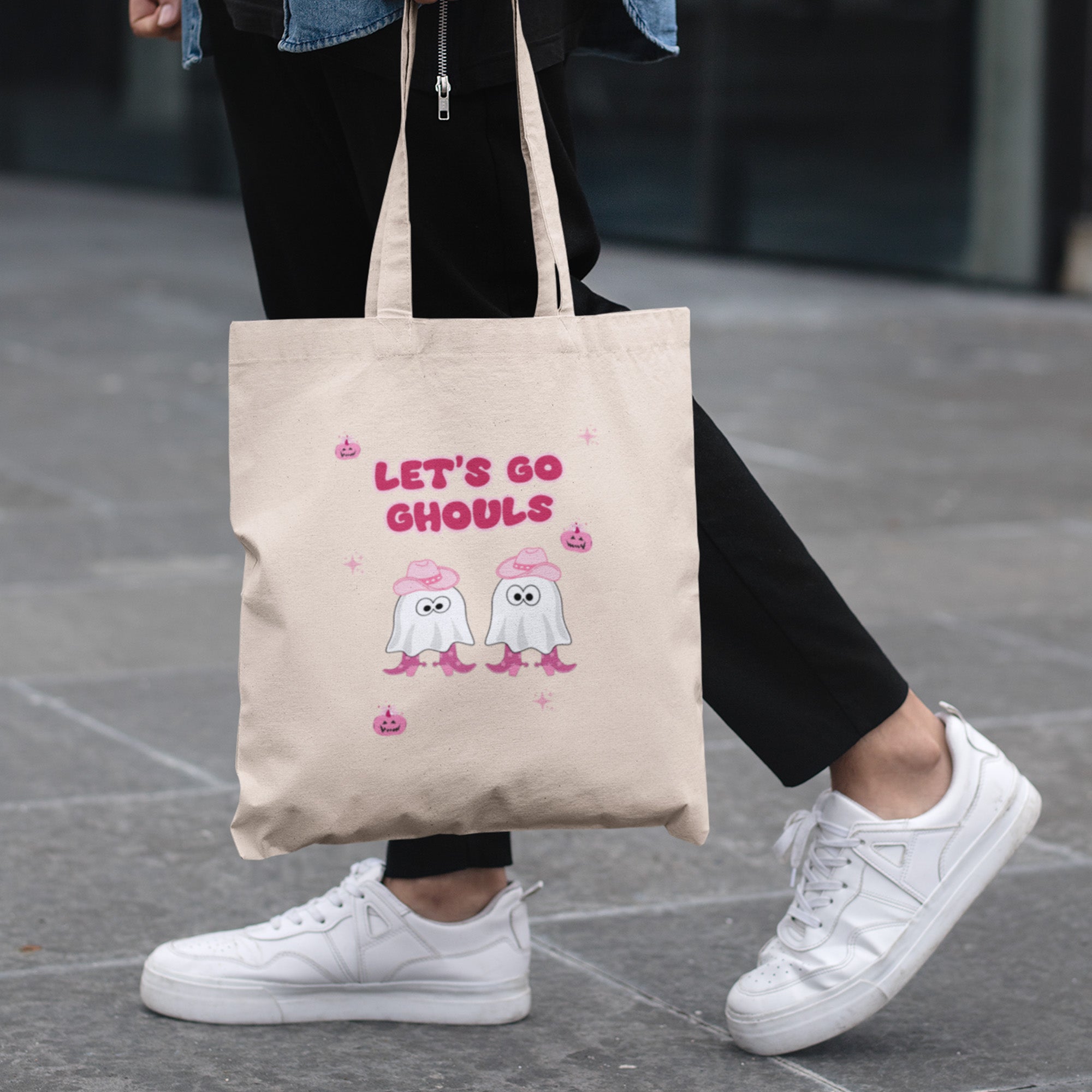 Let’s Go Ghouls Tote Bag, Cute Pink Ghost Halloween Bag, Funny Boo Basket Gift for Her, Girlfriend Halloween Tote, Best Friend Boo Box