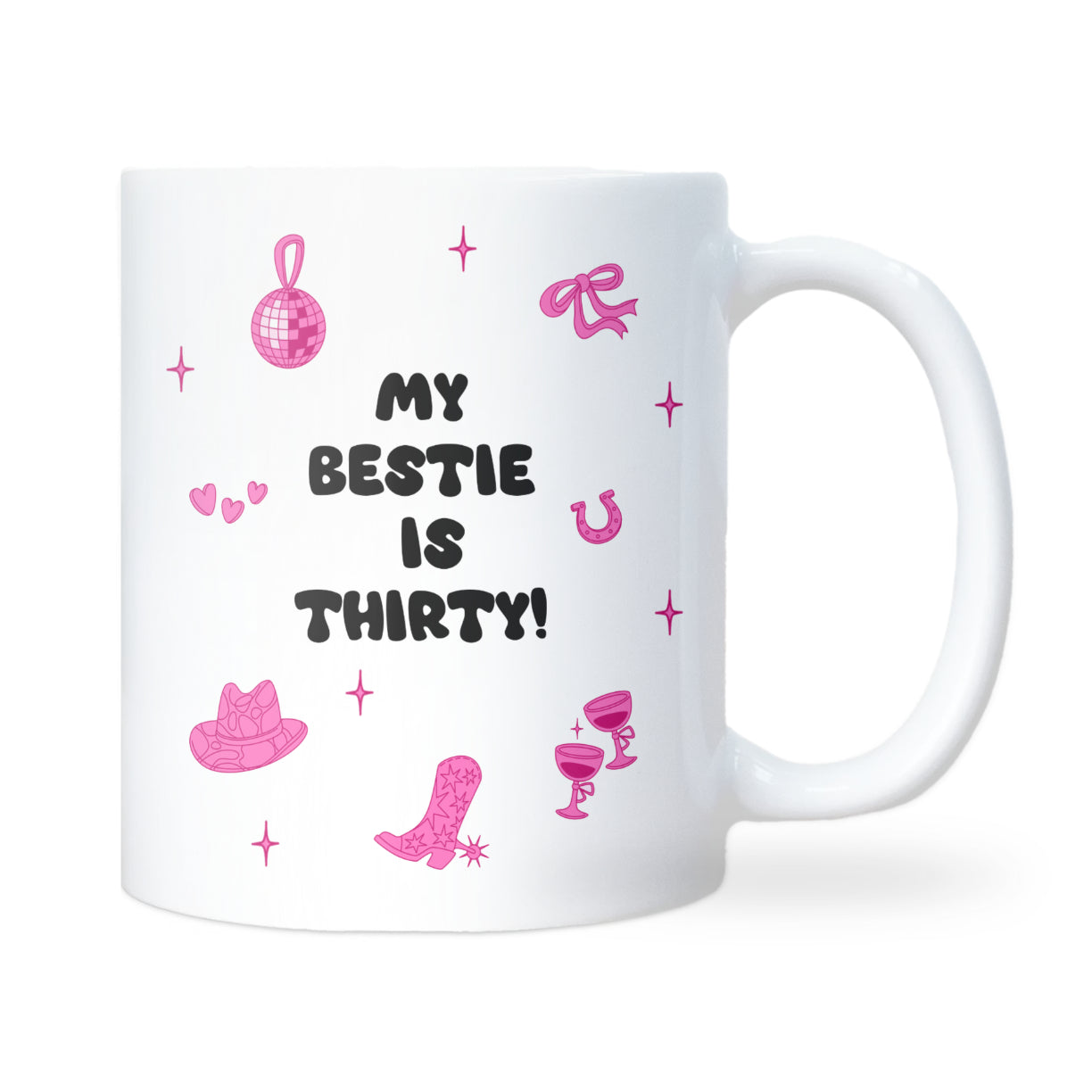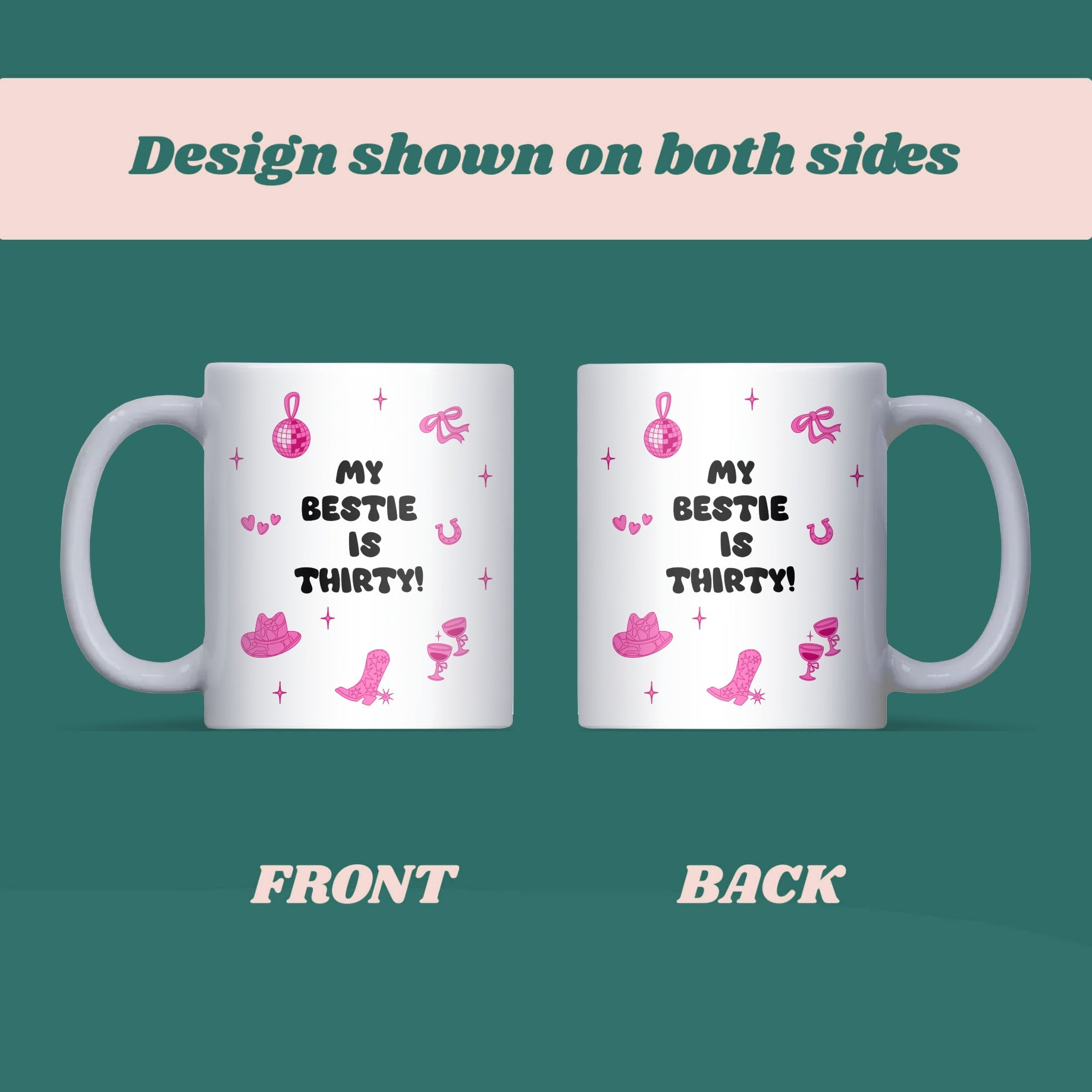 My Bestie is Thirty Mug, 30th Birthday Gift for Best Friend, Cowgirl Aesthetic 30th Birthday Mug with Disco Ball, Pink Bestie Birthday Mug