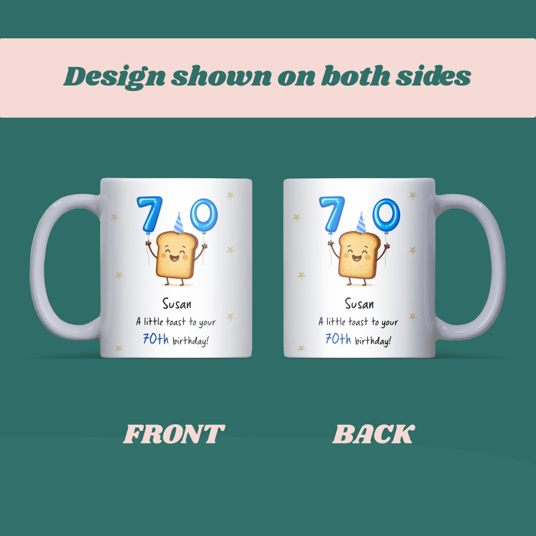 Put a smile on their face with this personalised 70th toast birthday mug! A fun and thoughtful way to celebrate a big milestone birthday for mum, dad, grandma, grandad, or friends.