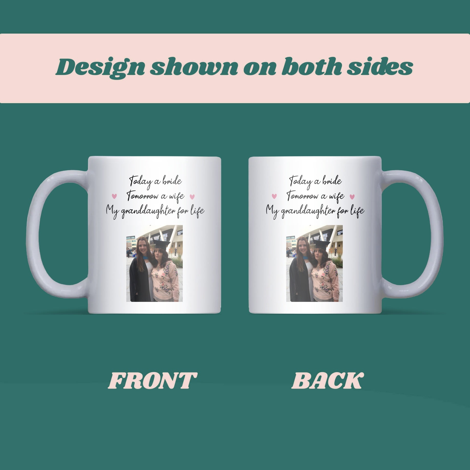 Celebrate your granddaughter’s special day with this personalised Today a Bride, Tomorrow a Wife mug. Personalise with an image of both the bride and grandma, it’s a heartfelt keepsake gift to show love and support.