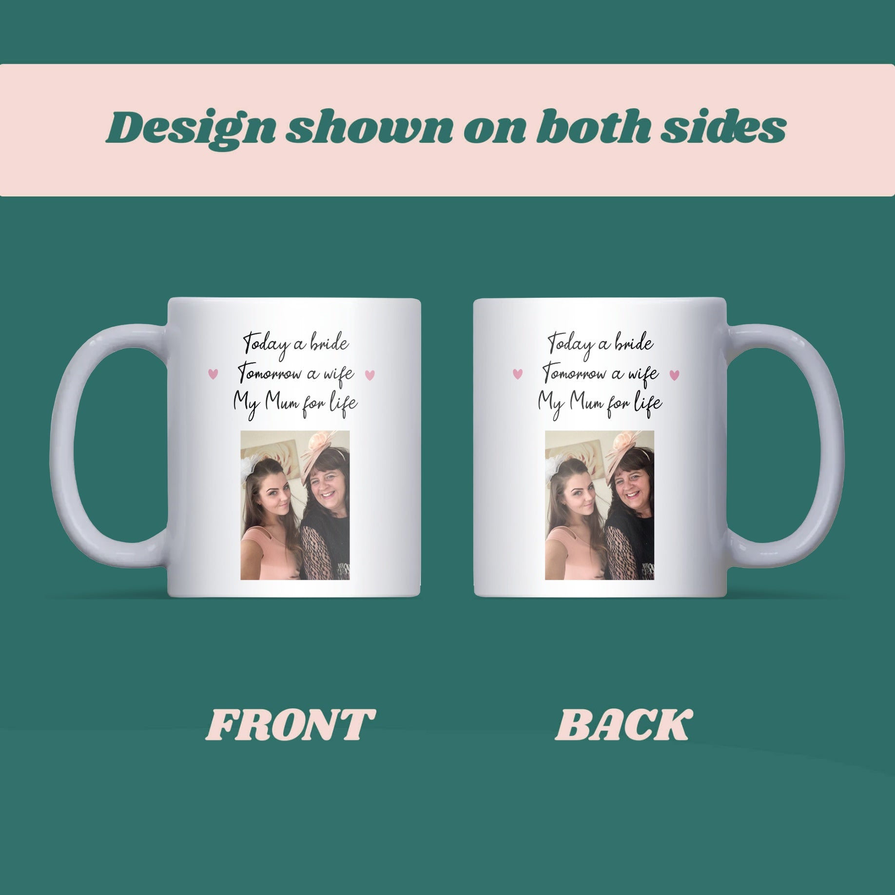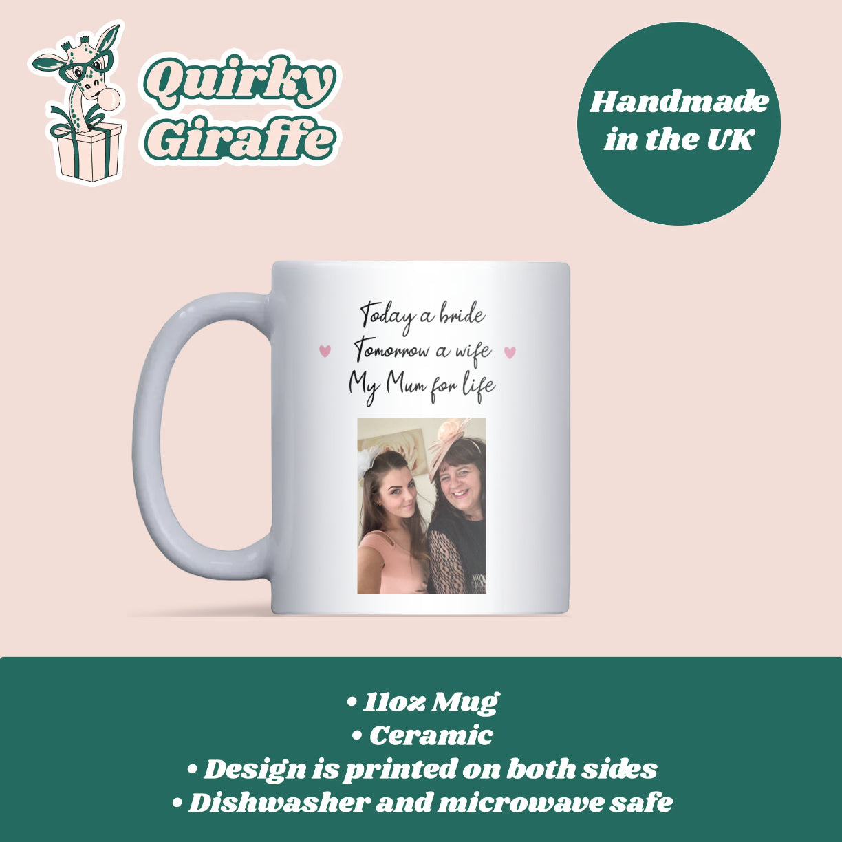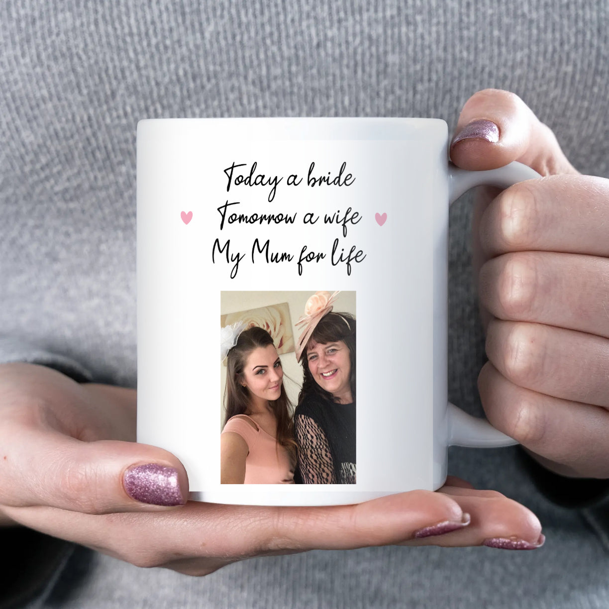 Celebrate your mum on your wedding day with this personalised Today a Bride, Tomorrow a Wife mug. Personalise with an image of both the bride and mum — a heartfelt keepsake gift to show love and appreciation. Perfect as a sentimental wedding gift from daughter to mum.