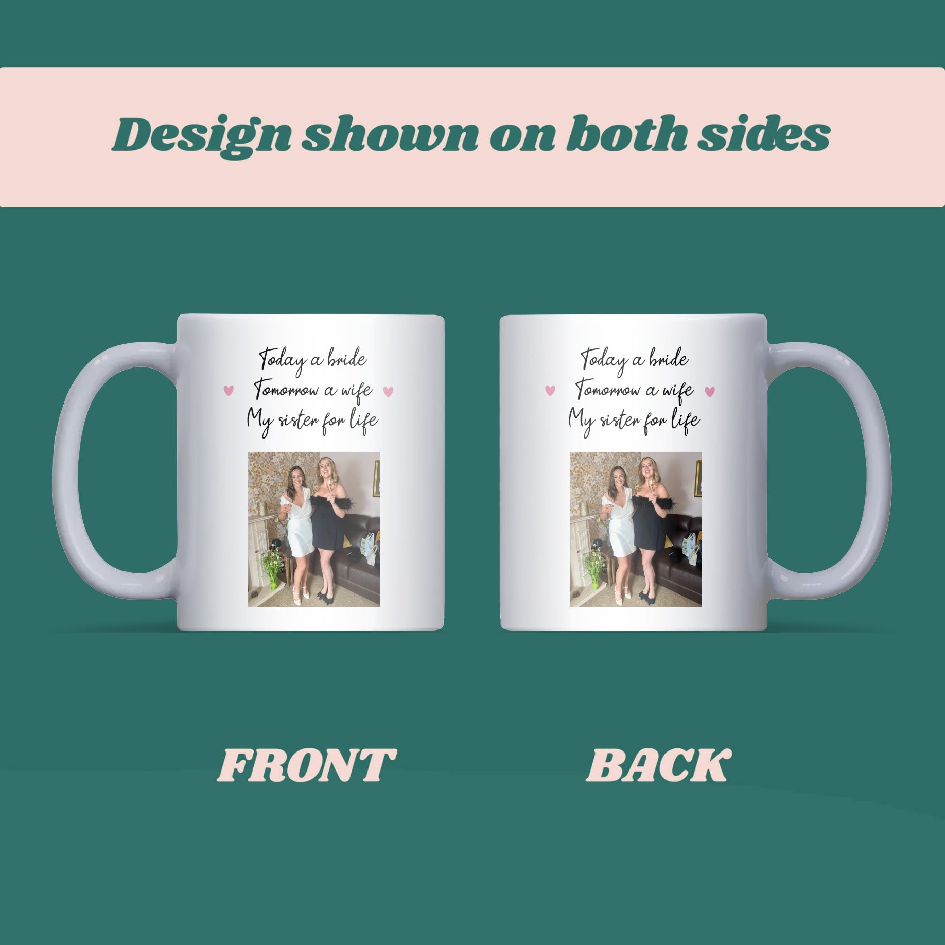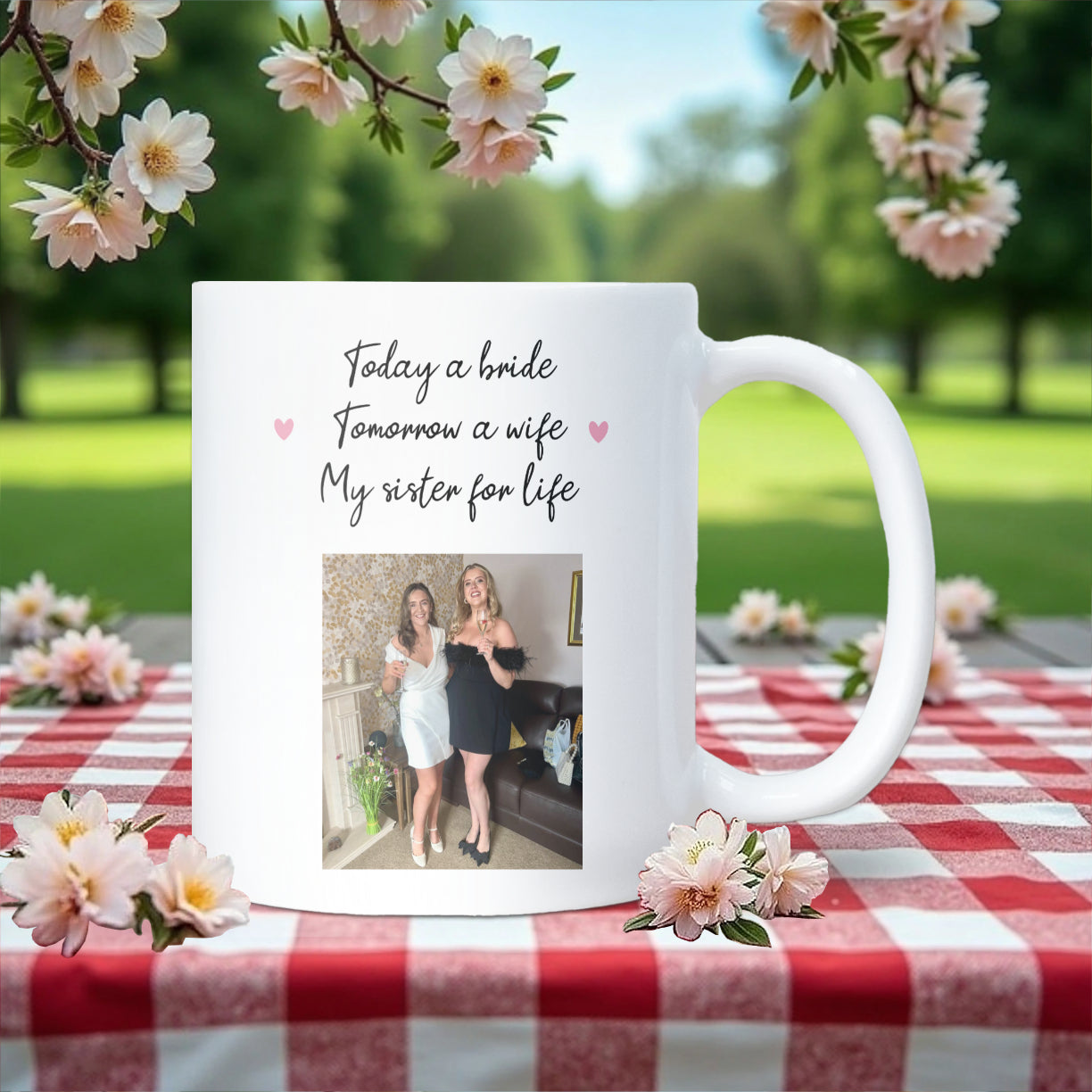 Celebrate your sister’s special day with this personalised Today a Bride, Tomorrow a Wife mug. Personalise with an image of both sisters — a heartfelt keepsake gift to show love and support. Perfect as a sentimental wedding gift from sister to sister.
