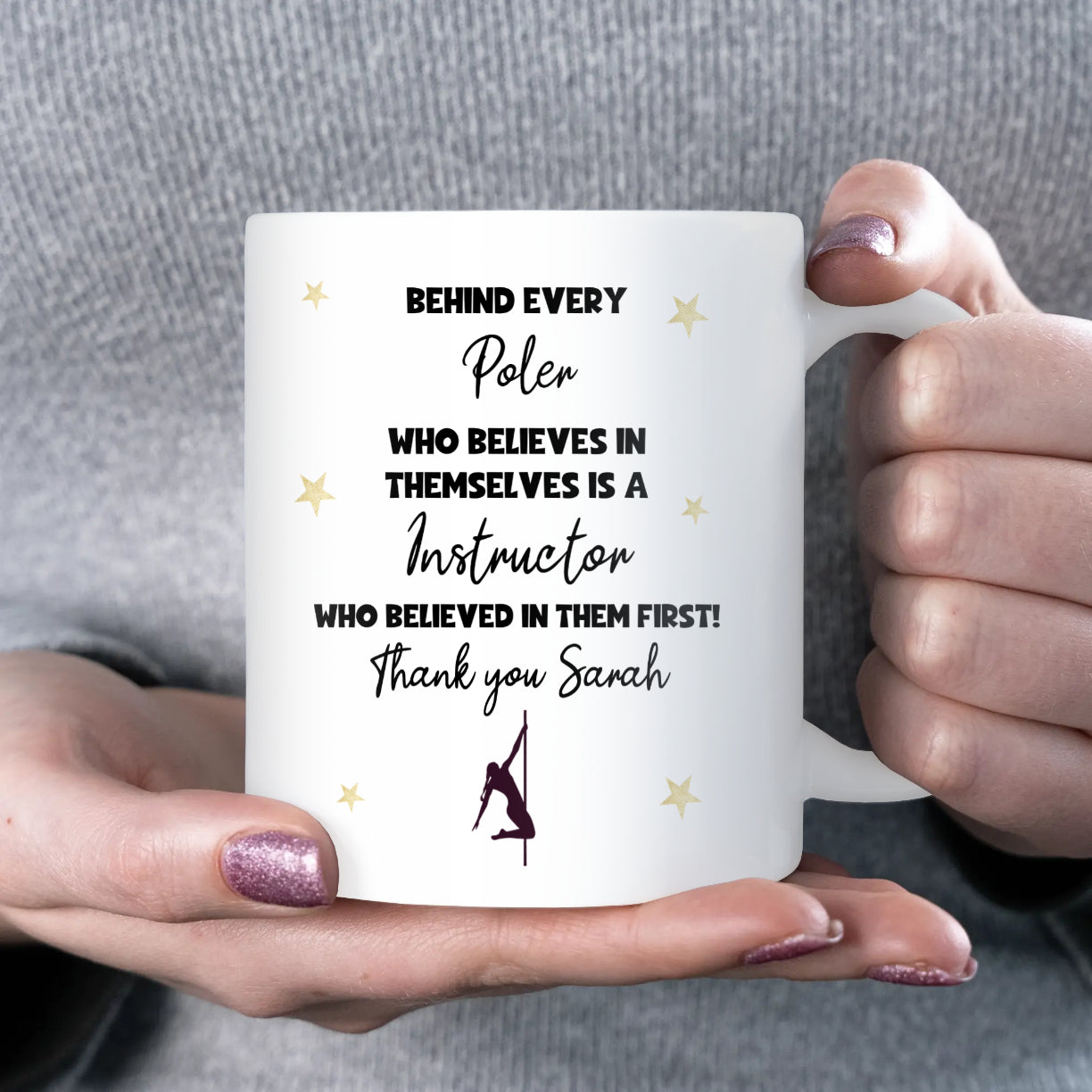 A meaningful thank you mug for a pole fitness instructor, featuring the quote “Behind every poler who believes in themselves is an instructor who believed in them first.”