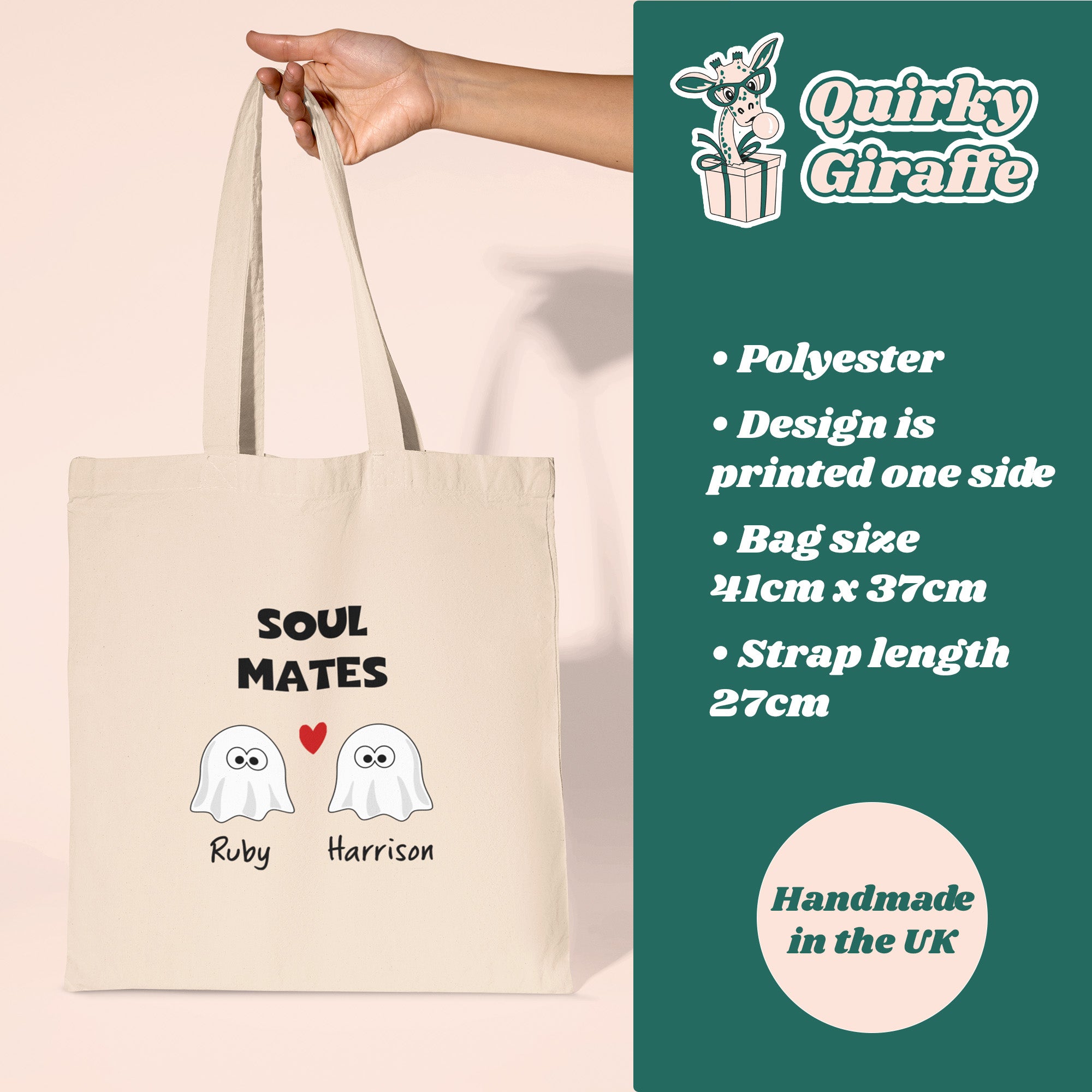 Celebrate spooky love with this personalised Soul Mates tote bag, featuring two ghostly cartoon figures and your chosen names underneath. A unique and thoughtful gift for couples, girlfriends, wives, or besties – perfect as part of a Boo Basket or Boo Box. Reusable, practical, and adorable, this tote is ideal for carrying essentials with a spooky twist.