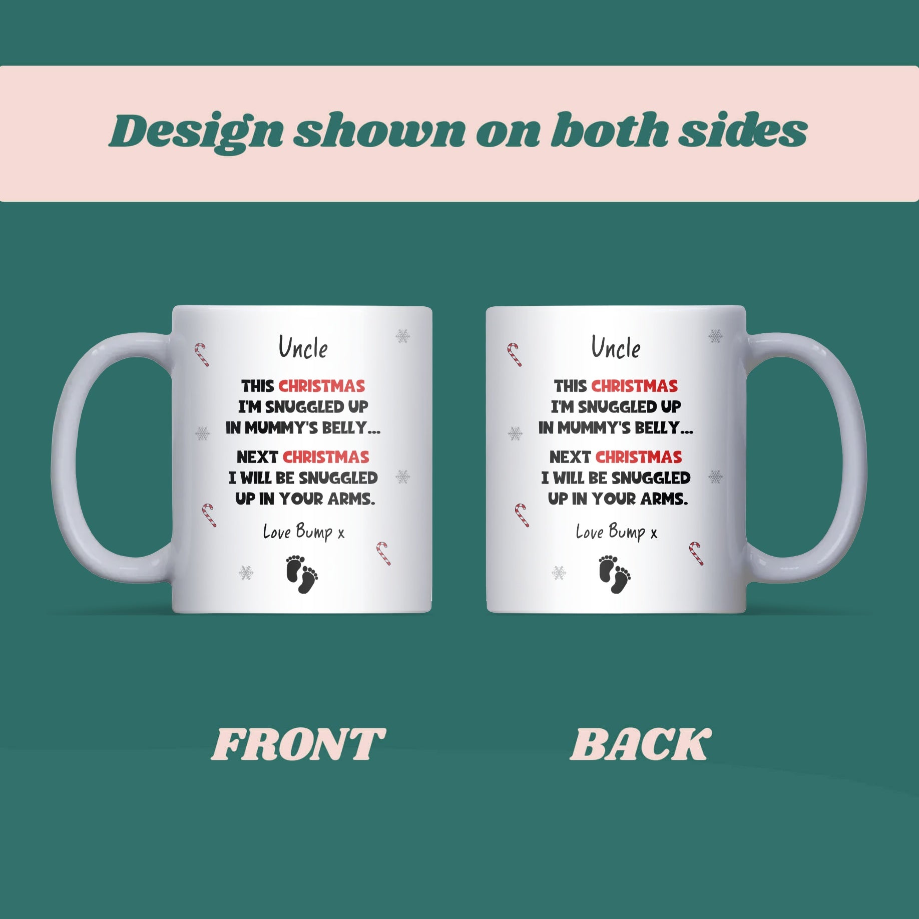 Make him smile with this To Uncle at Christmas From Bump mug — a thoughtful way to announce a pregnancy or celebrate his first Christmas as an uncle. This charming keepsake mug is perfect for coffee, tea, or hot chocolate, and a sweet reminder of his exciting new role.